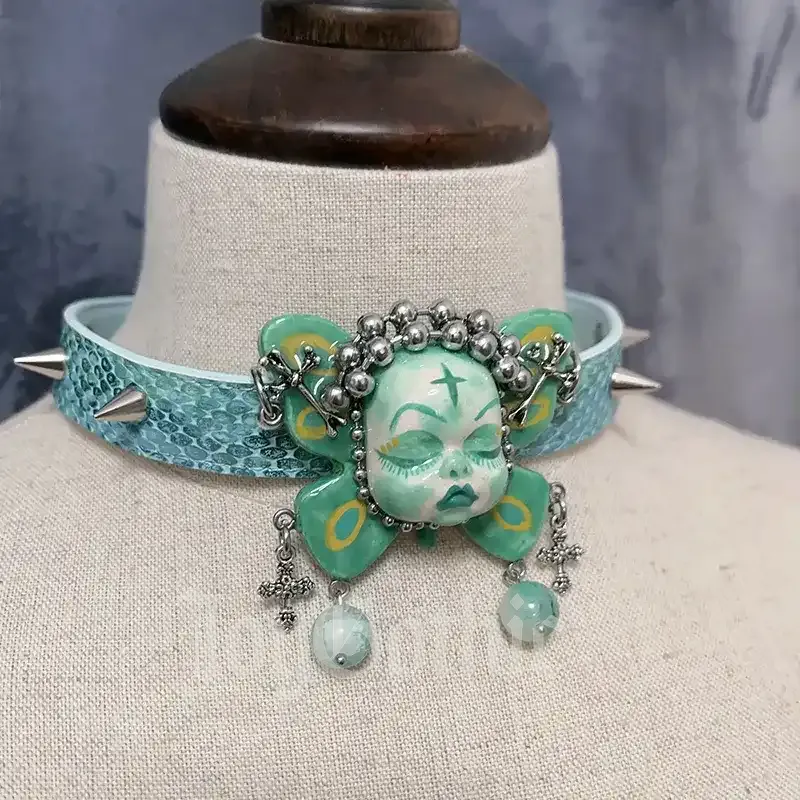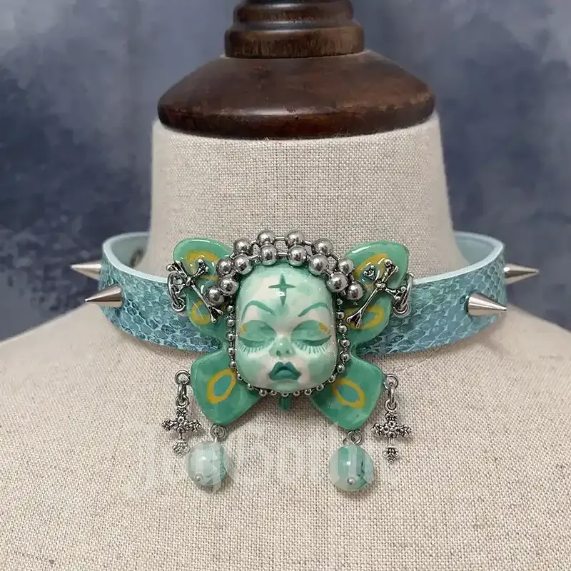 Punk Spiked ChokerHandmade Blue Doll Punk Spiked Choker, Y2K Gothic Choker Necklace, Dark Fairy Statement Jewelry, Alt Birthday Gift