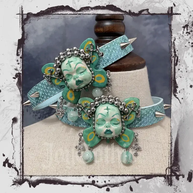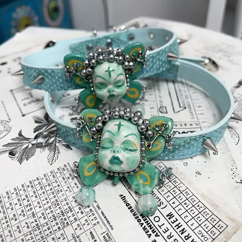 This punk spiked choker doesn’t shout. It watches. A sleeping fairy face rests at your throat like a quiet vow. Soft blue tones meet cold metal and sharp studs. It feels intimate, almost ritual-like. It belongs at night shows, art spaces, festivals, and anywhere your identity matters more than approval.