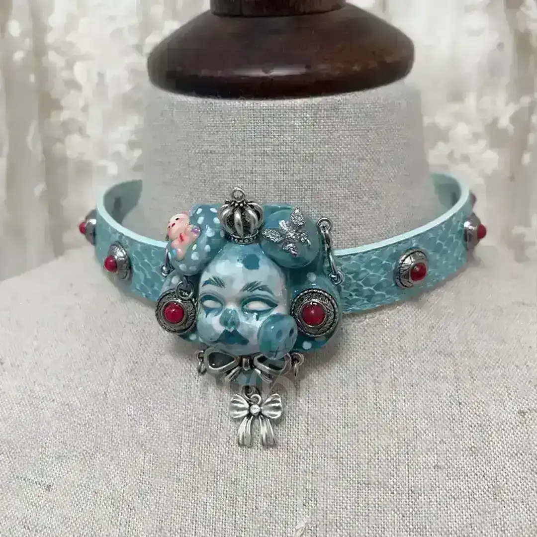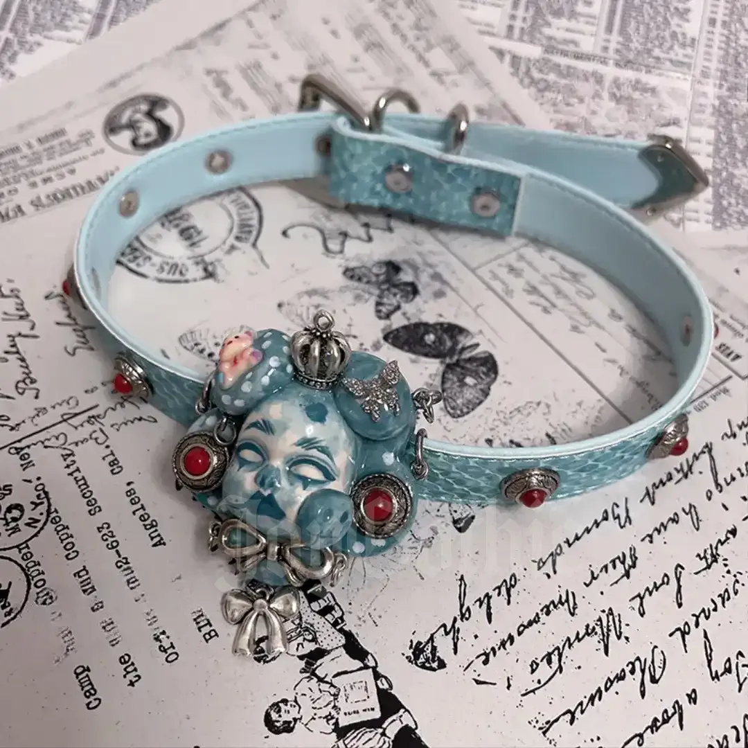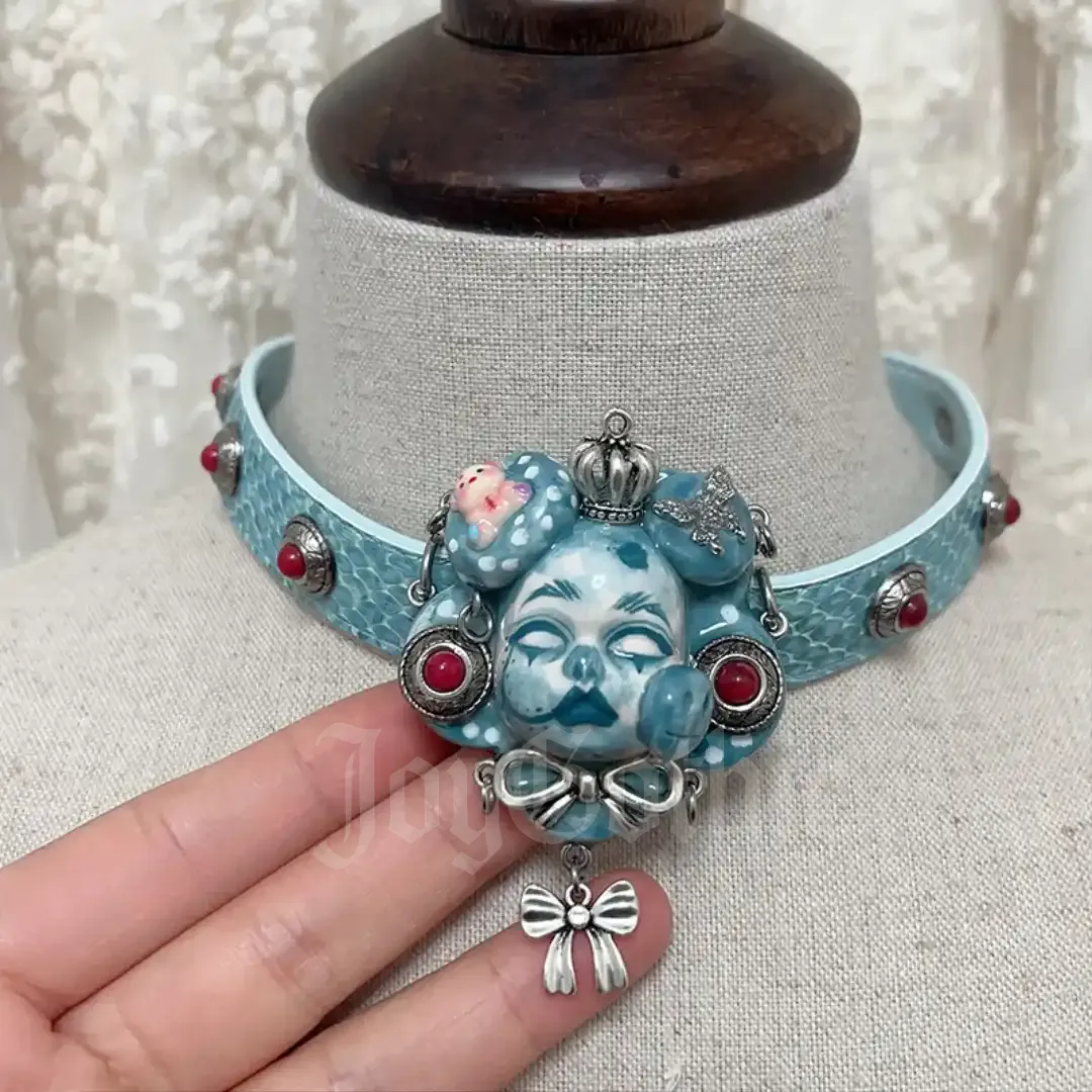 This blue goth choker is for the ones who collect looks and secrets. The hand-sculpted stone clay doll face has closed eyes and a tiny painted mustache, like childhood toys grown up with bad intentions. Little charms and a crown give it a baroque, playful sadness that fits right into pastel goth, dollcore, and dark kawaii wardrobes. It is a statement collar that turns identity into an accessory you can put on and never apologize for.