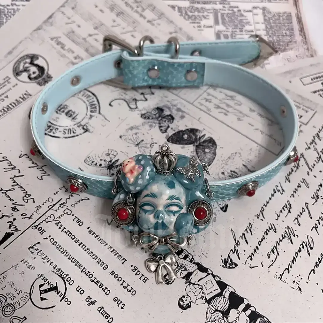 There’s something unsettling in the best way about this pastel goth choker. The pale blue doll face feels like a memory you’re not sure you made up, the kind that stays with you longer than it should. The red cabochons look like tiny warnings against all the people who keep trying to soften you. You put it on and you’re no longer trying to fit into anyone’s idea of gentle. You become the version of yourself that stops apologizing.