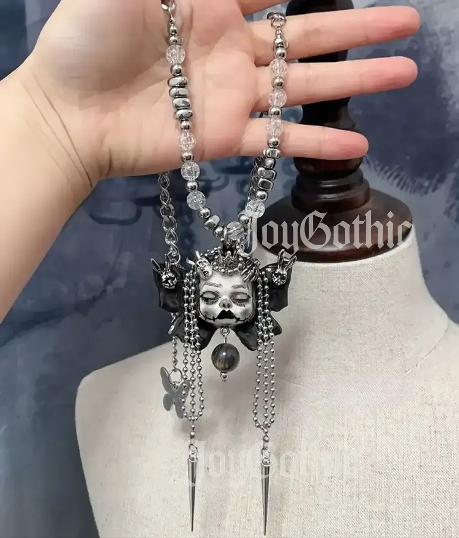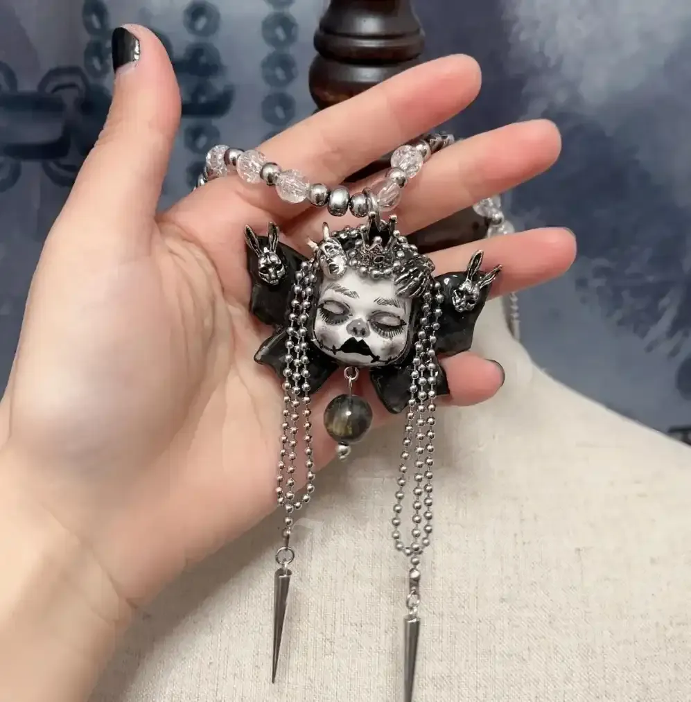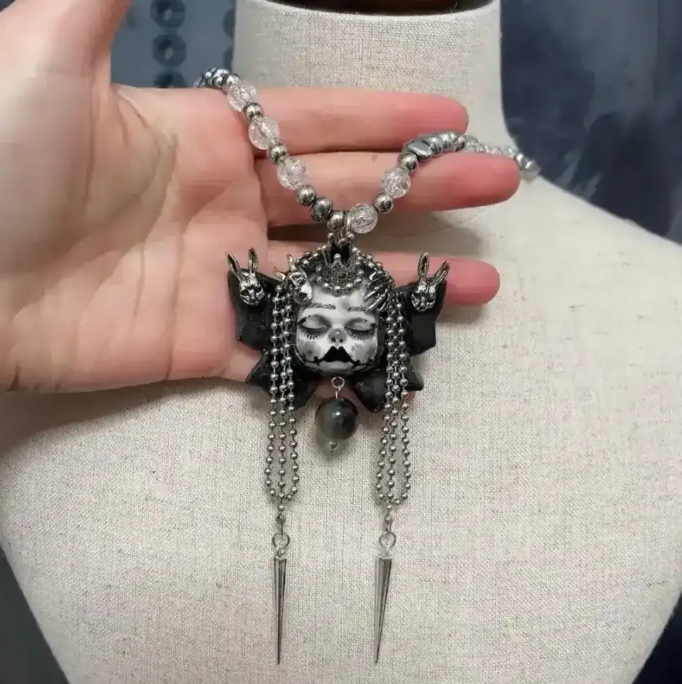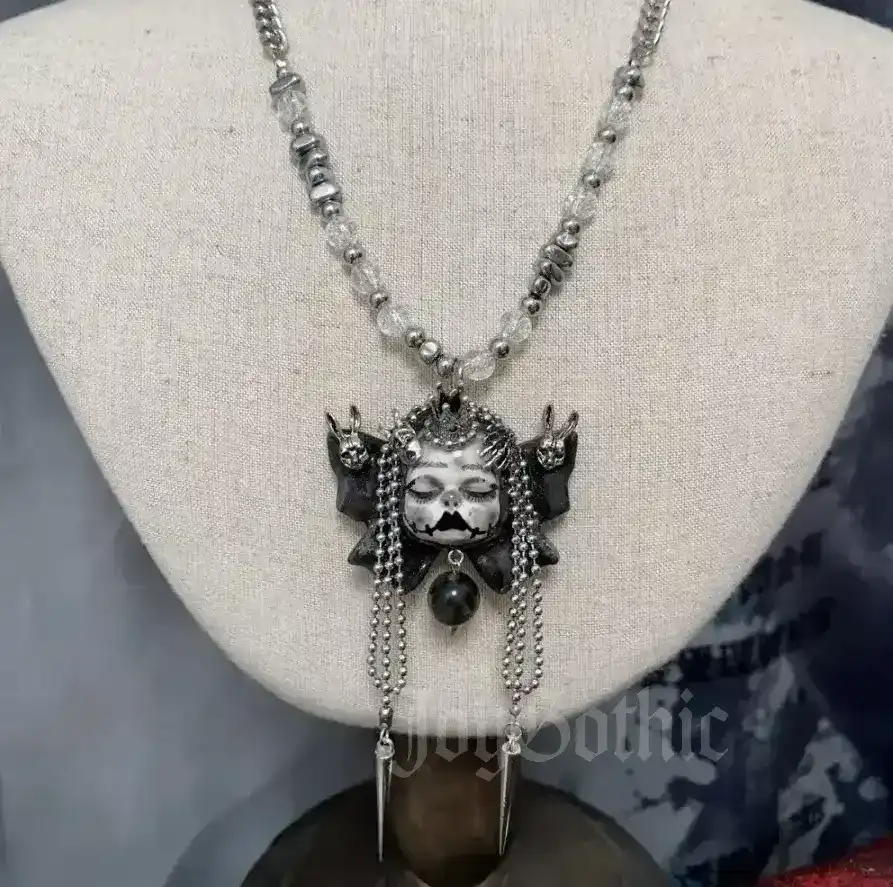 You know the feeling of walking through a world that doesn’t always see you. The quiet moments when you crave something that reflects the parts of yourself you keep hidden. This gothic butterfly necklace was made for that. Every clay goth doll is sculpted by hand, shaped into a butterfly with a crowned head and wings that carry hidden faces. A glass bead hangs beneath the chin, catching the light like a tiny, frozen memory.