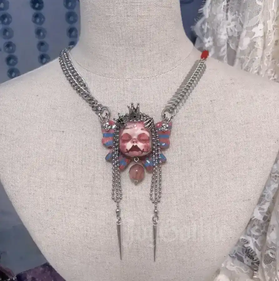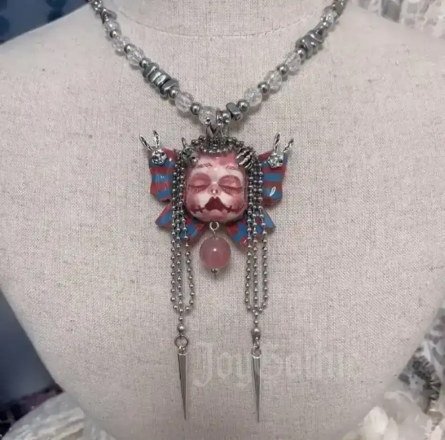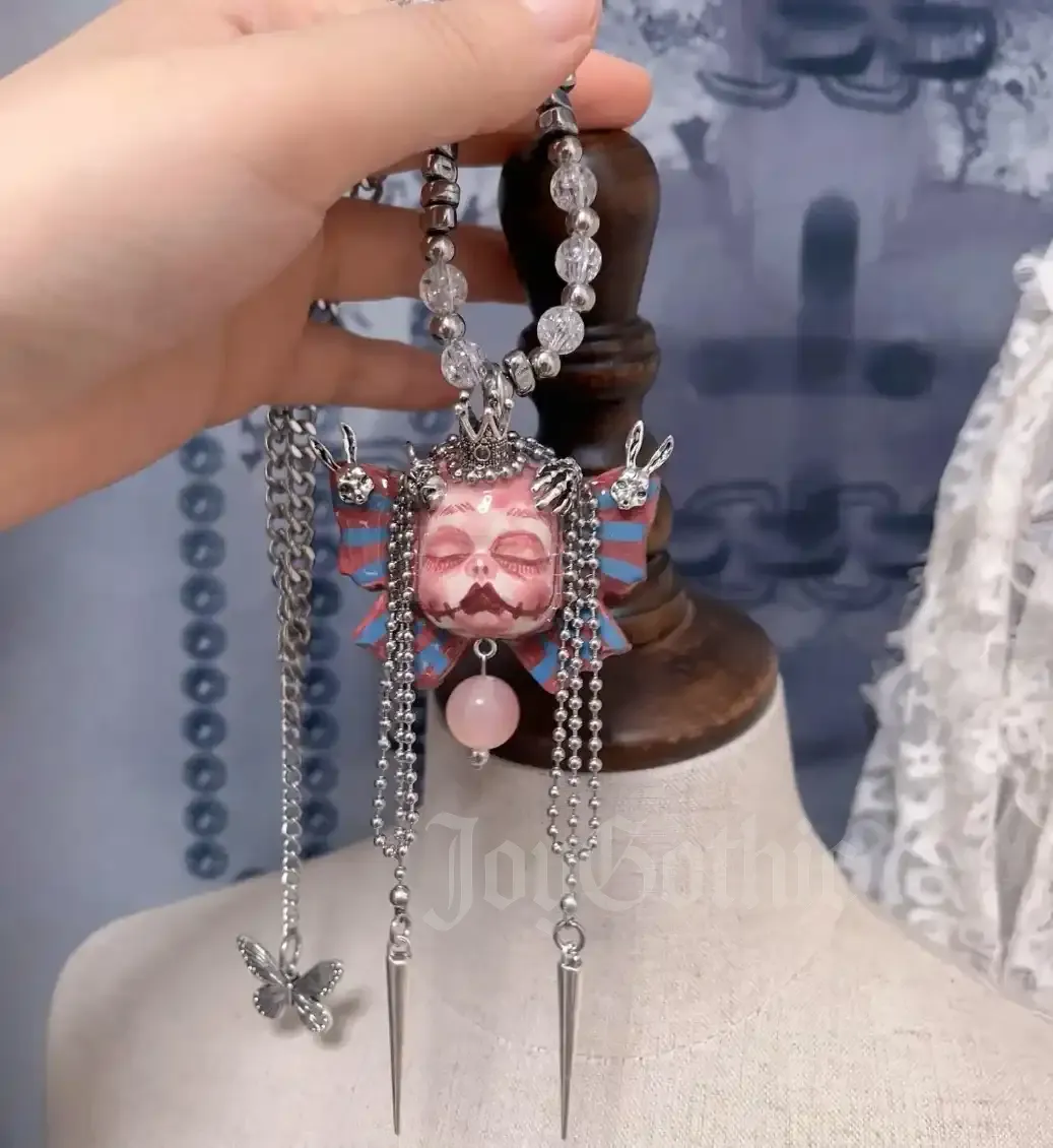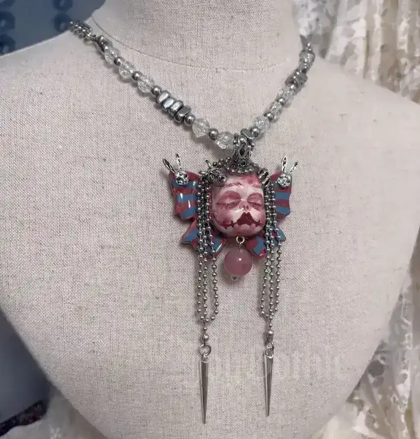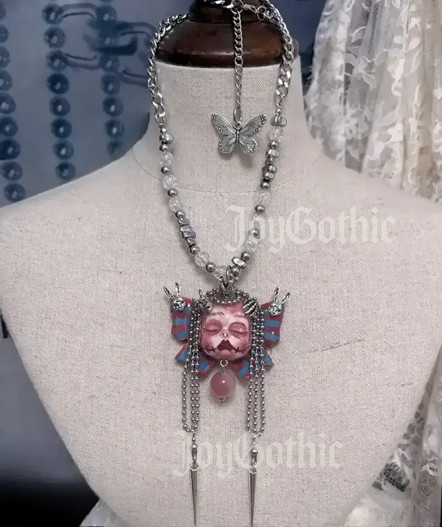 You know the feeling of walking through a world that doesn’t always see you. The quiet moments when you crave something that reflects the parts of yourself you keep hidden. This gothic butterfly necklace was made for that. Every clay goth doll is sculpted by hand, shaped into a butterfly with a crowned head and wings that carry hidden faces. A glass bead hangs beneath the chin, catching the light like a tiny, frozen memory.