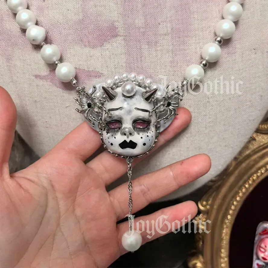 This white goth necklace was born from the small rituals and moments that define modern gothic life. I imagined a goth girl getting ready for a night out at a dimly lit concert or a cozy gathering with friends. She layers her black lace, velvet, or oversized sweaters and reaches for jewelry that reflects her mood. The hand-painted white face of the doll captures the quiet intensity she feels when the world doesn’t see her. The pearl on the brow is a nod to inner strength. The spikes and tiny spider charms mirror the edgy, protective armor she wears against judgment.