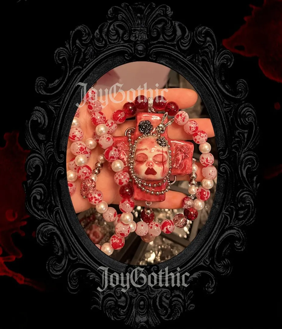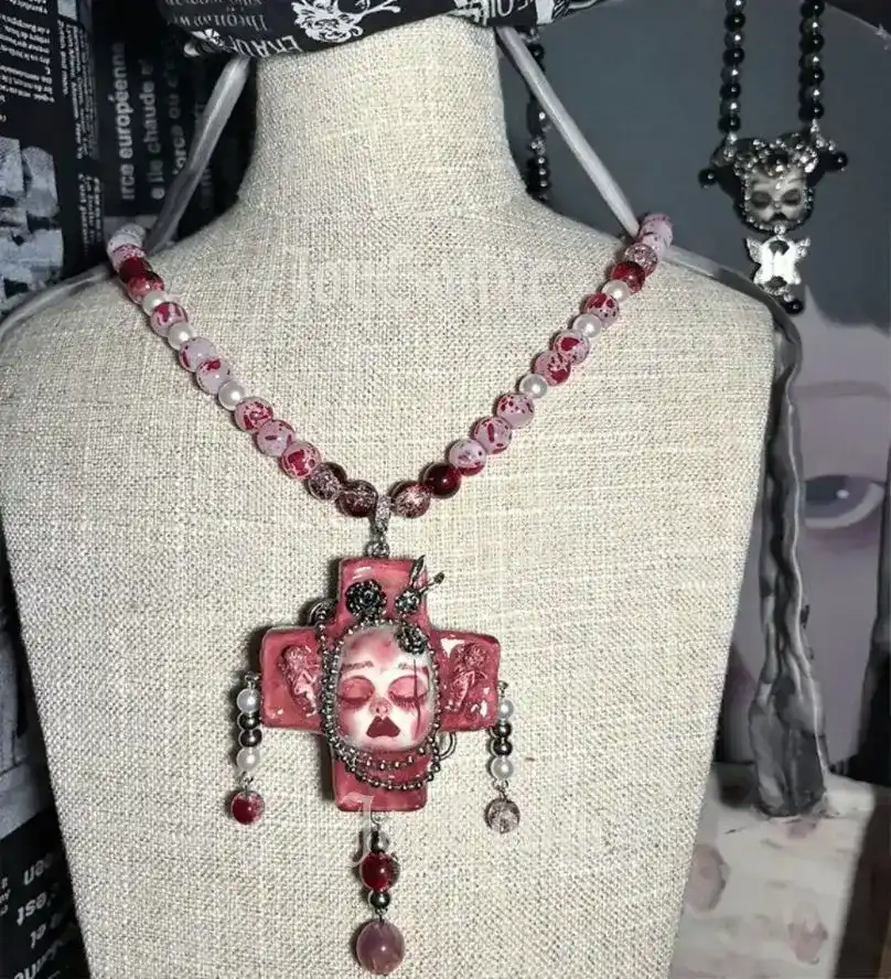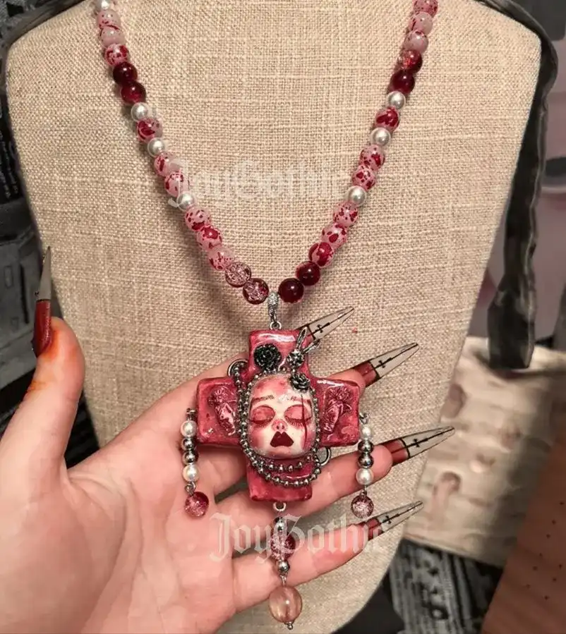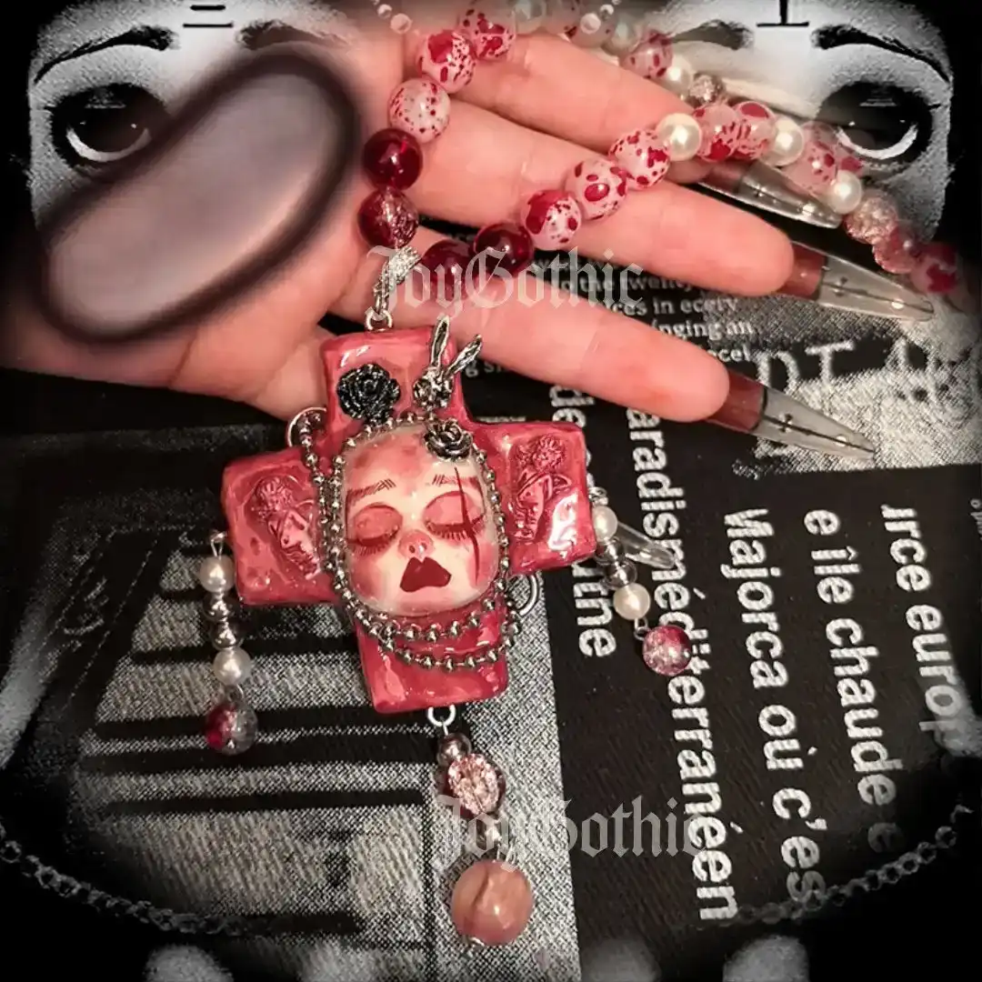 Elevate your gothic style with this handmade cross pendant necklace, a unique blend of dark elegance and playful edge. Each necklace features delicate doll charms, set against a detailed cross centerpiece. Strung with glass beads, it adds a subtle sparkle to your look. Ideal for alternative fashion lovers, club nights, or everyday statement outfits. Stand out with a piece that’s both bold and whimsical.