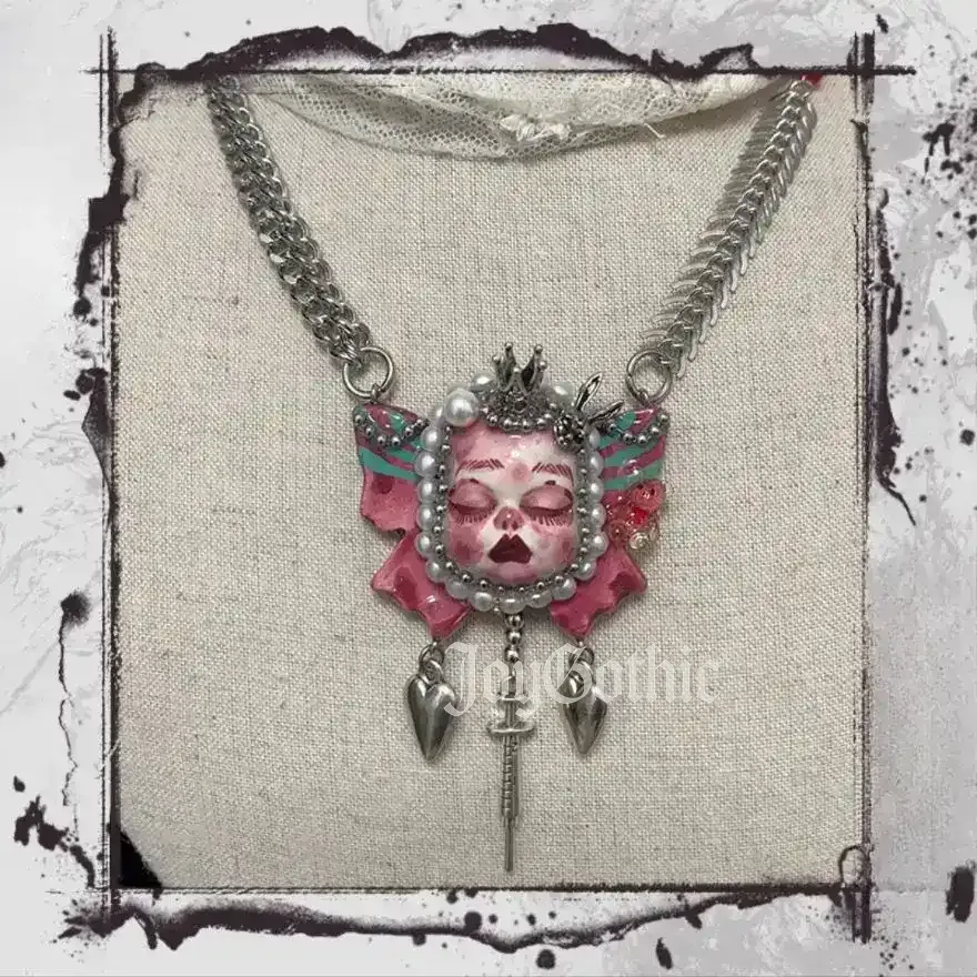 This gothic jewelry set captures the soul of dark femininity and millennial nostalgia. The centerpiece, an eerie yet delicate goth doll butterfly, symbolizes transformation through darkness. Handmade from stone clay and crowned with metallic accents, each detail tells a story: the beaded halo framing her porcelain face, the dangling cross beneath her chin, and the twin metal hearts beneath her wings. It’s a wearable art piece for those who find beauty in the macabre.