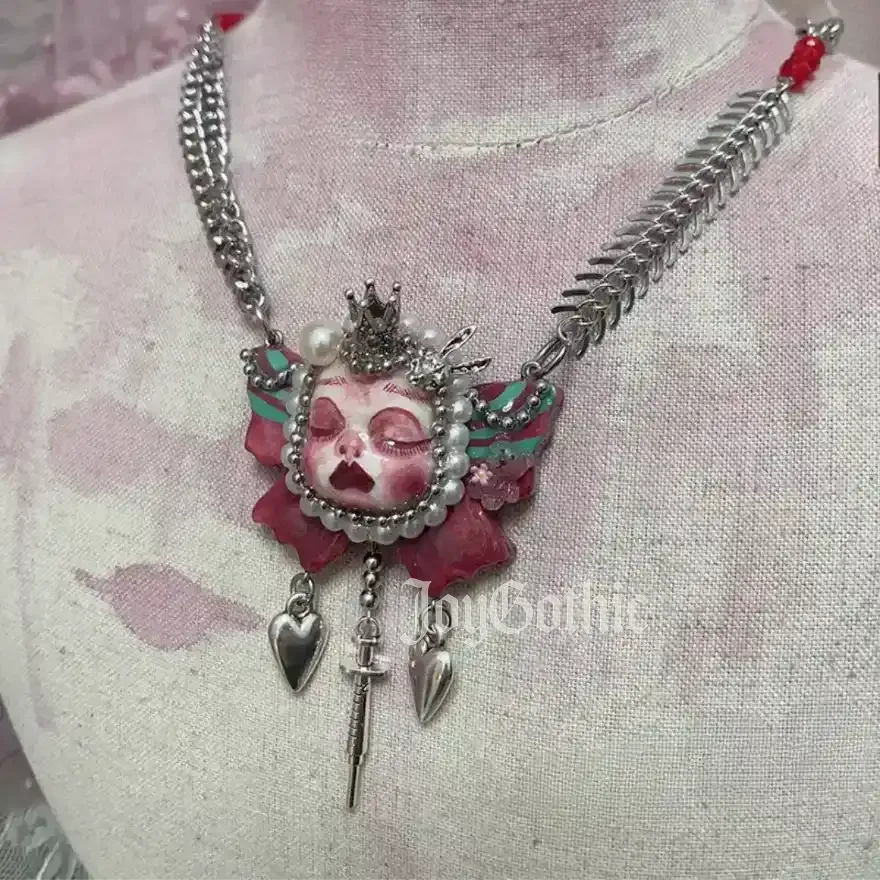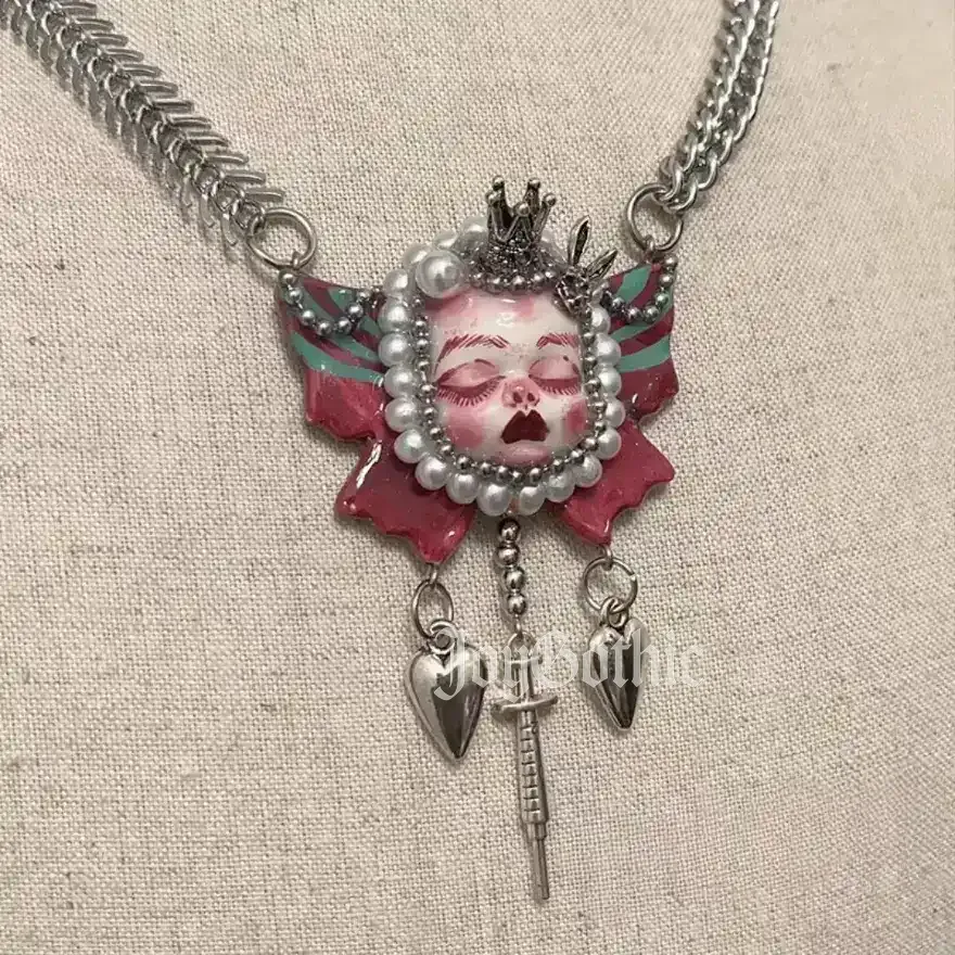 This hauntingly beautiful gothic jewelry set merges dark elegance with alt Y2K rebellion. Each piece is crafted by hand with shaped clay, shimmering glass beads, and metallic charms. The butterfly-winged goth doll pendant evokes a twisted fairytale aesthetic, fragile yet powerful. Wear it to amplify your dark romance energy or as a statement piece for late-night adventures.