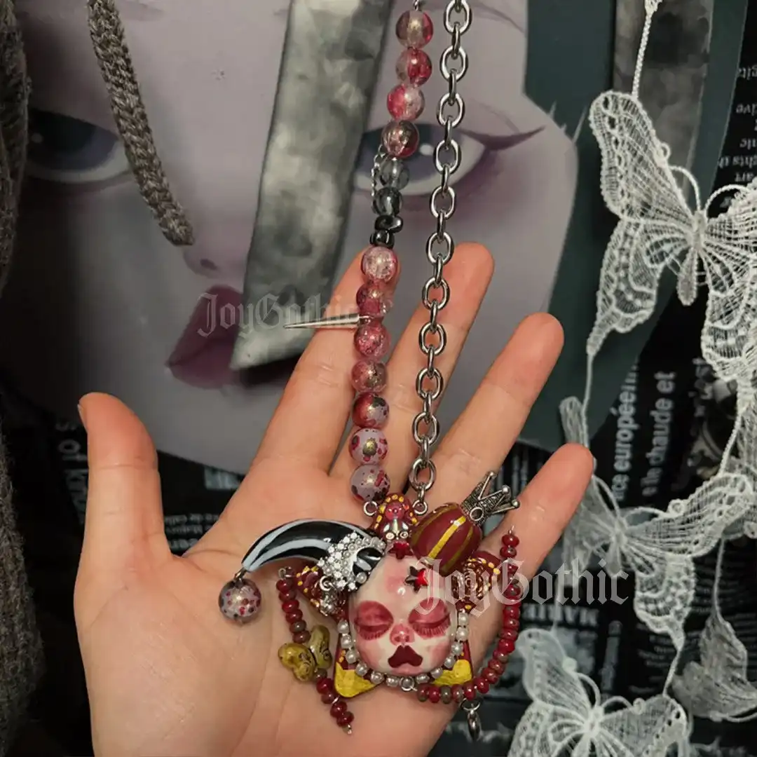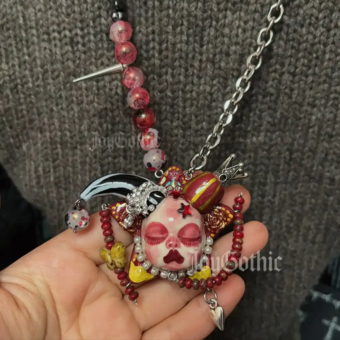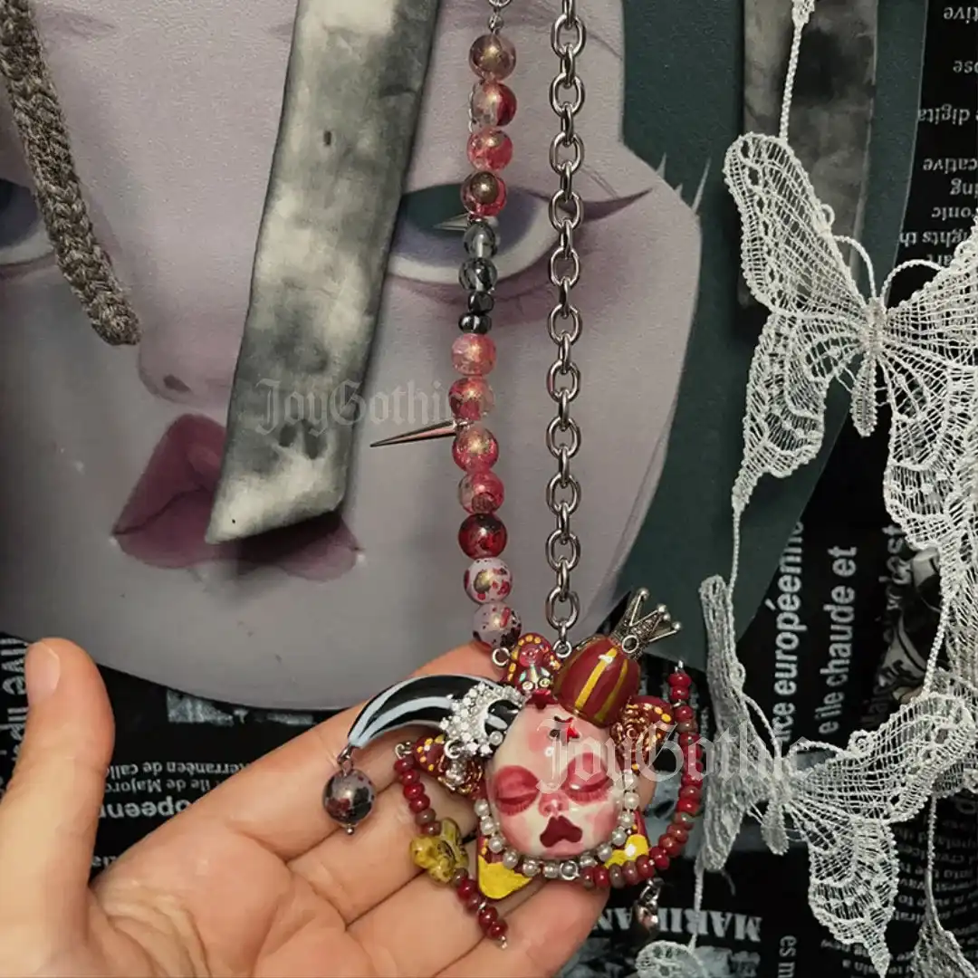 This red punk choker was designed for alt girls who treat jewelry like armor. The centerpiece is a hand-painted stone-clay pendant with closed-eye, mask-like features and matte, distressed paintwork that reads both theatrical and melancholic. It’s a visual anchor for dark gothic outfits. Surrounding the pendant are mixed media elements, including faceted speckled glass beads, small faux-pearls, and a heavy titanium-steel link chain that contrasts polished and oxidized textures. Tiny crown and crescent motifs sit among draped bead swags and a subtle spike accent, creating a layered, story-rich look that performs under stage lights and in everyday streetwear.