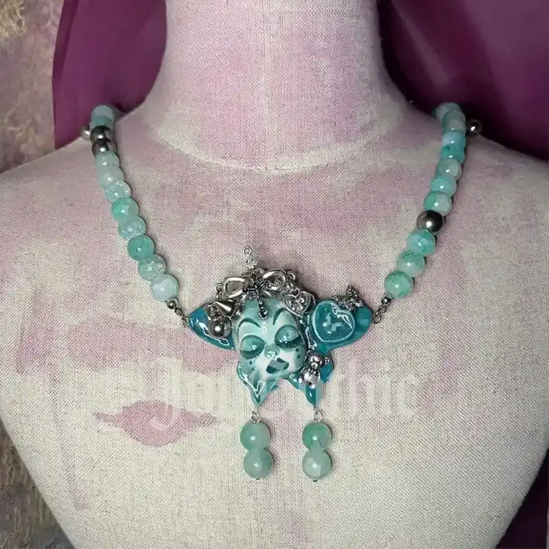 The pendant features a dreamlike jester-inspired face with soft, closed eyes and a serene expression. It blends whimsy with a slightly eerie calm, giving it the feel of a fantasy mask rather than a traditional clown. The sculpted ears and tiny metal accents create a character that feels otherworldly, playful and mysterious at the same time. Paired with the cool teal glaze and dangling bead drops, the piece carries a quiet drama that fits perfectly with gothic, pastel goth and alternative aesthetics.