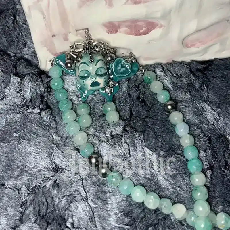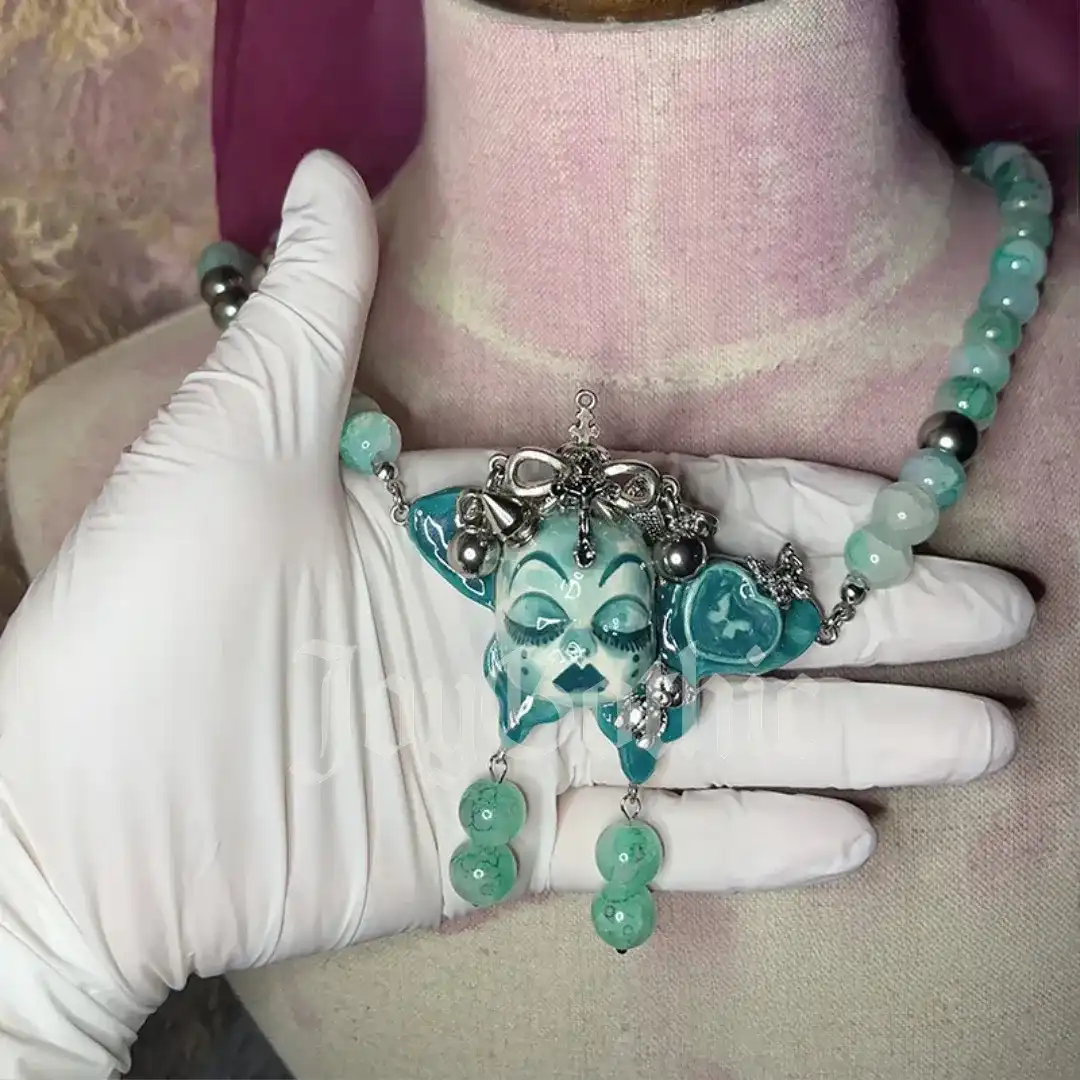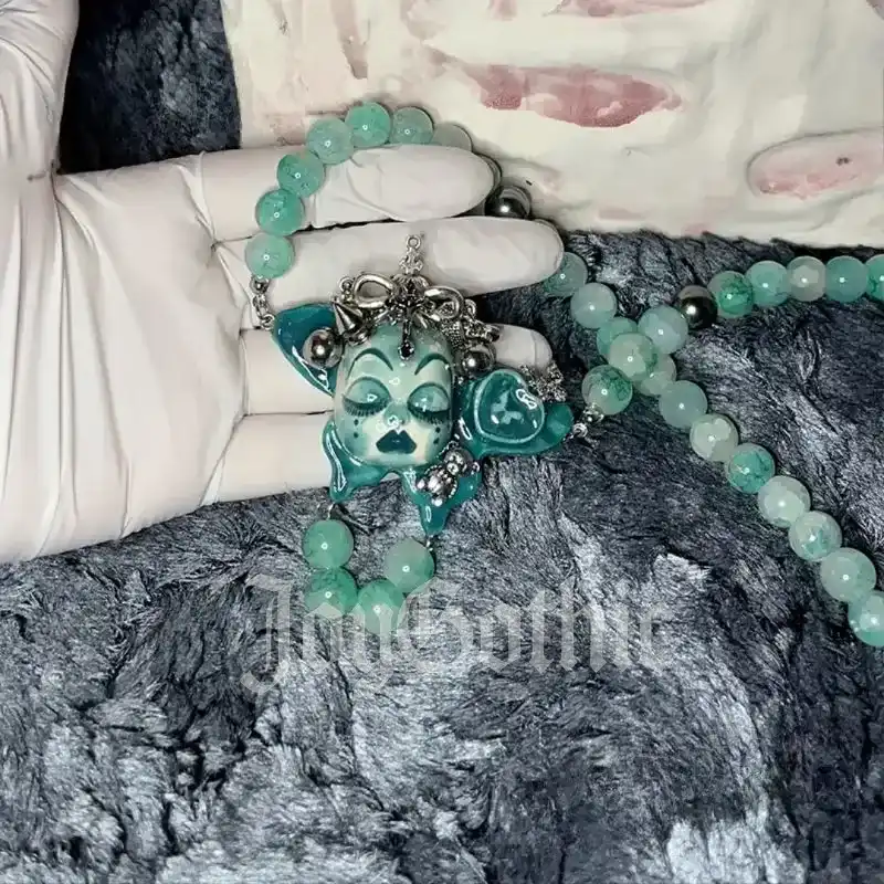 You believe your jewelry should do more than match an outfit. It should tell a story about who you are. This gothic teal necklace wears like a little stage prop for the everyday, a doll face glazed in green with tiny charms and bow details that feel both whimsical and dark. The paired beads and twin dangling strands create movement so it catches light as you enter a room. If self expression and identity matter to you, this piece becomes part of how you present yourself to the world.