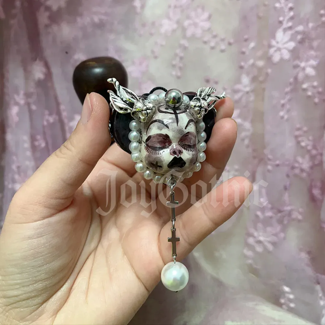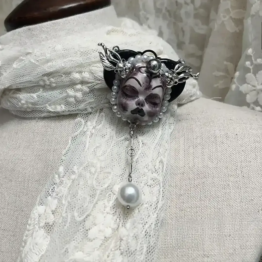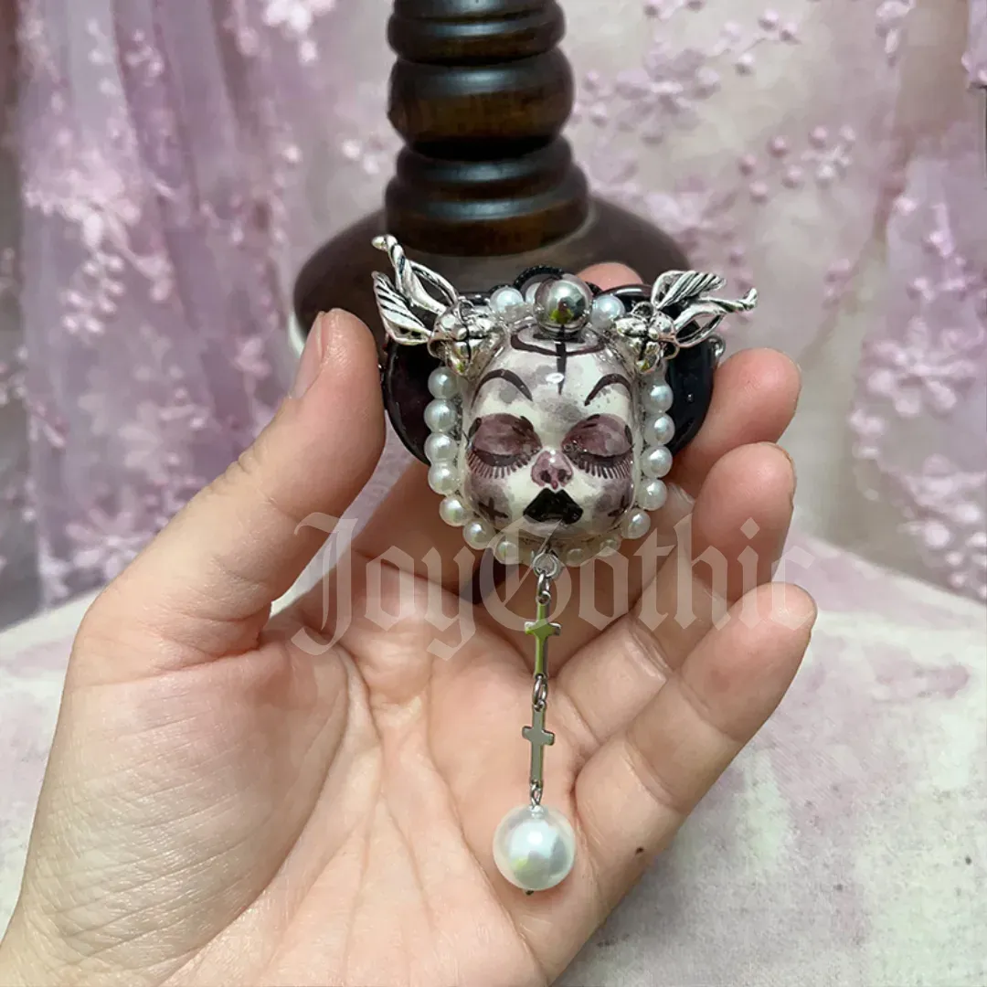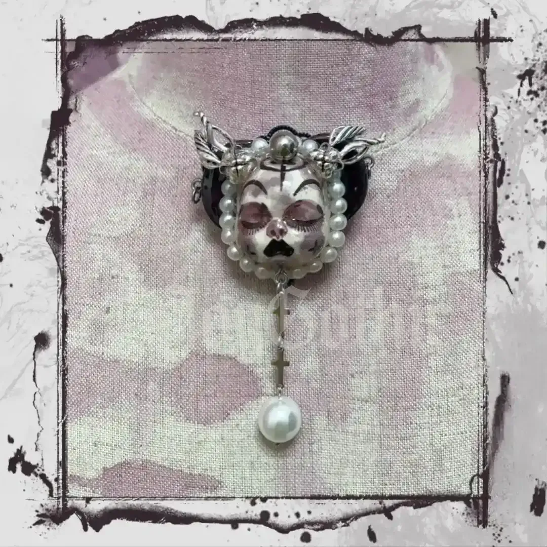 This gothic brooch adds a subtle touch of sorrow and story to your look. The centerpiece is a hand shaped stone clay doll face with soft, hand painted features and slightly closed eyes. A halo of simulated pearls surrounds the face to contrast fragile beauty with darker tones. Small silver leaf accents and a bead crown give the piece a vintage, museum heirloom feeling. The dangling chain with tiny crosses leads to a single large faux pearl that adds movement and quiet drama.