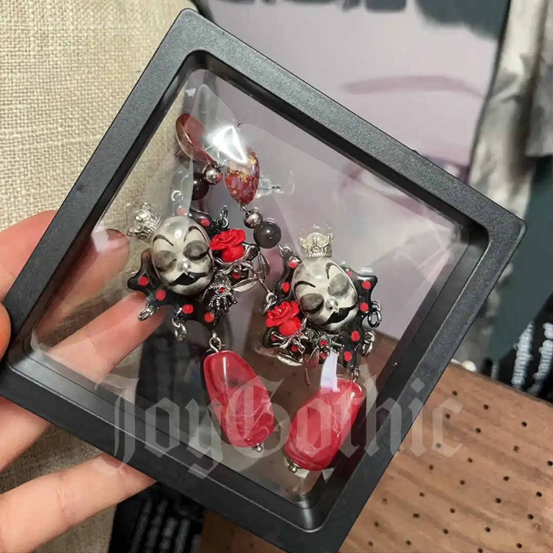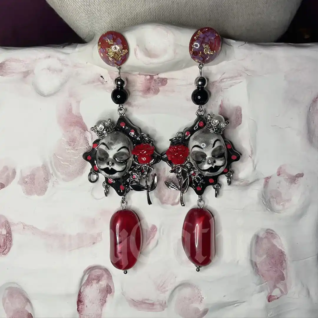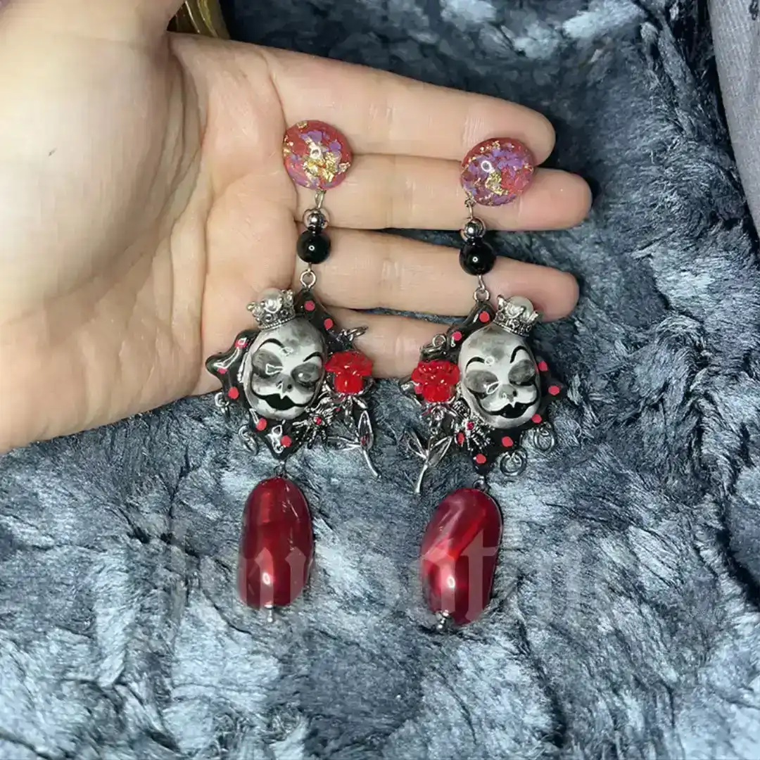 This pair of gothic earrings is wearable drama that reads as confidence. The jester skull face looks sleepy and sly at the same time which speaks to people who find power in contradiction. Small red roses bring a touch of romance while the crown adds a hint of reclaimed authority. When you put these jester earrings on you are choosing to be seen as complex and deliberate instead of anonymous and safe.