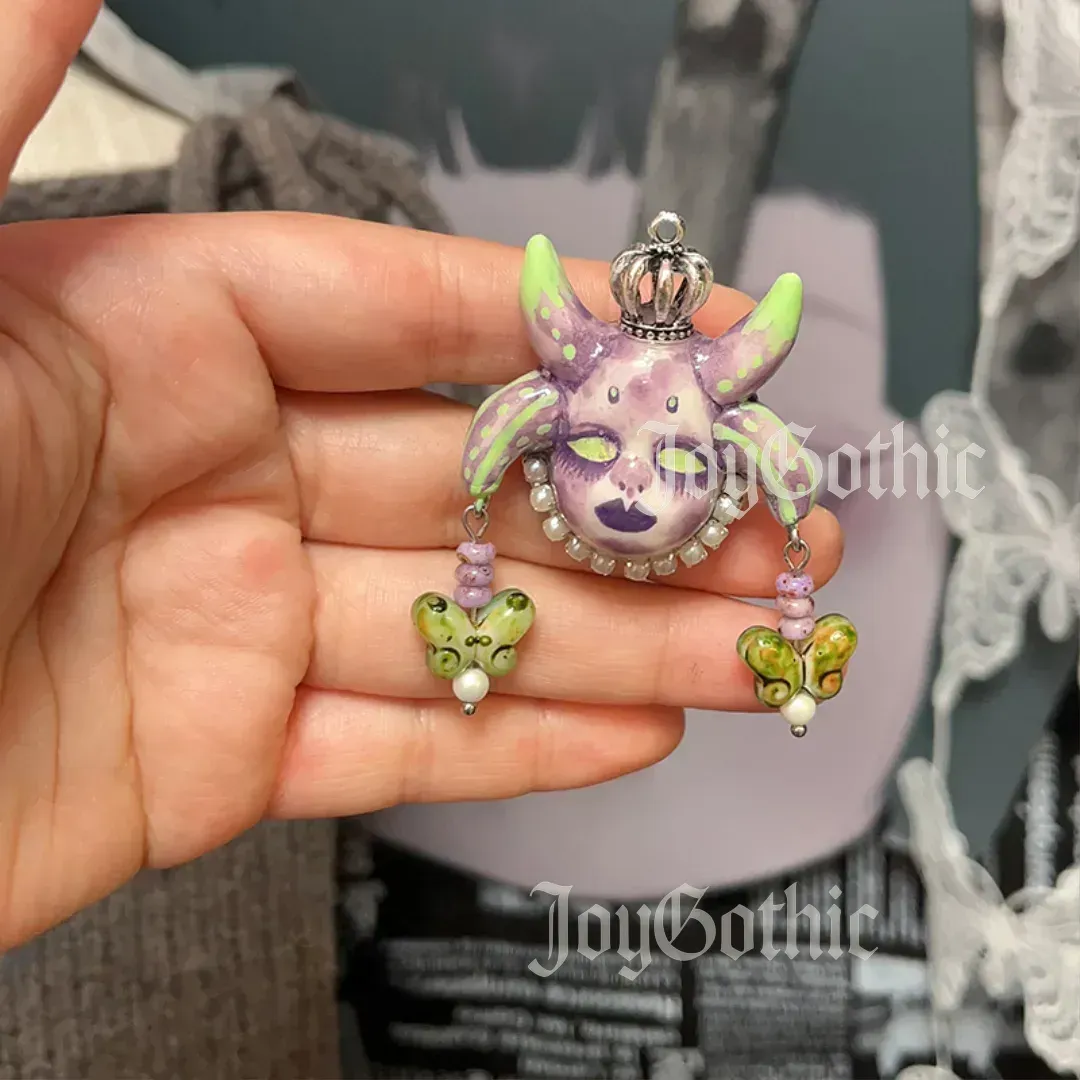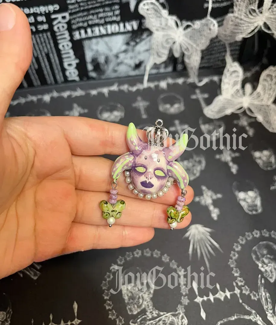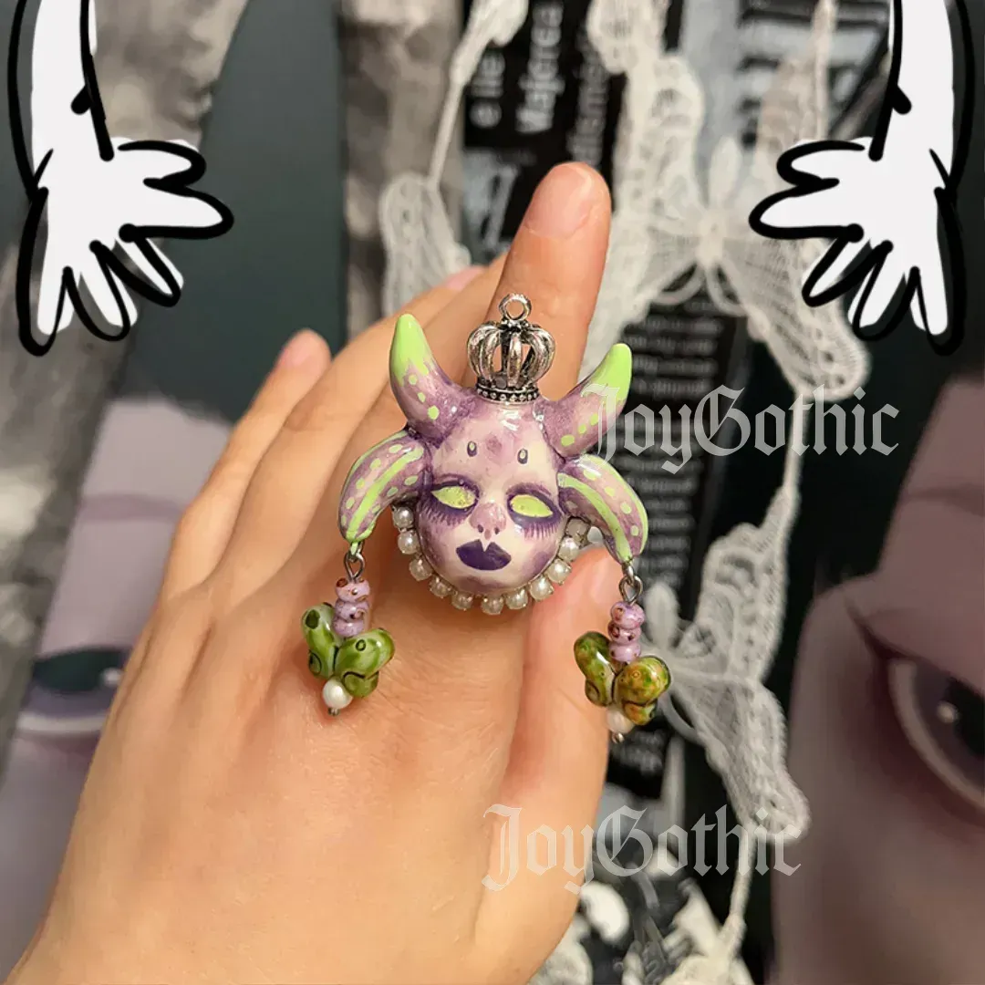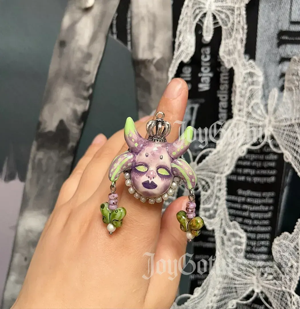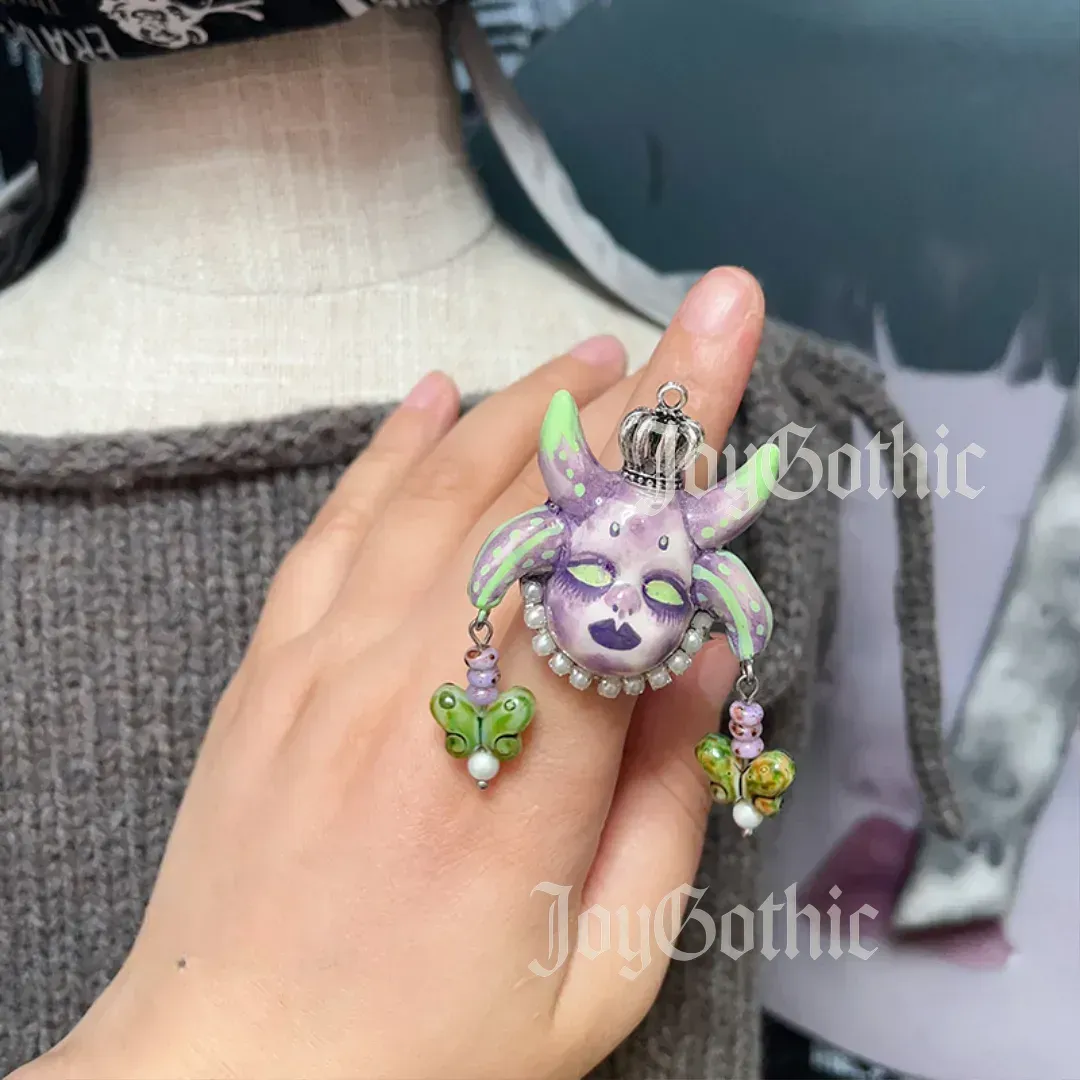 This hand-painted purple gothic ring carries a story for you to wear and shape. It’s a tiny talisman of individuality and dark beauty. At its center, a delicate gothic doll sits crowned in mystery, with twin pairs of horns rising and falling from her head, each whispering tales of rebellion and elegance. Dangling glass beads and butterfly charms catch the light, while the carefully shaped clay shows every hand-made detail.