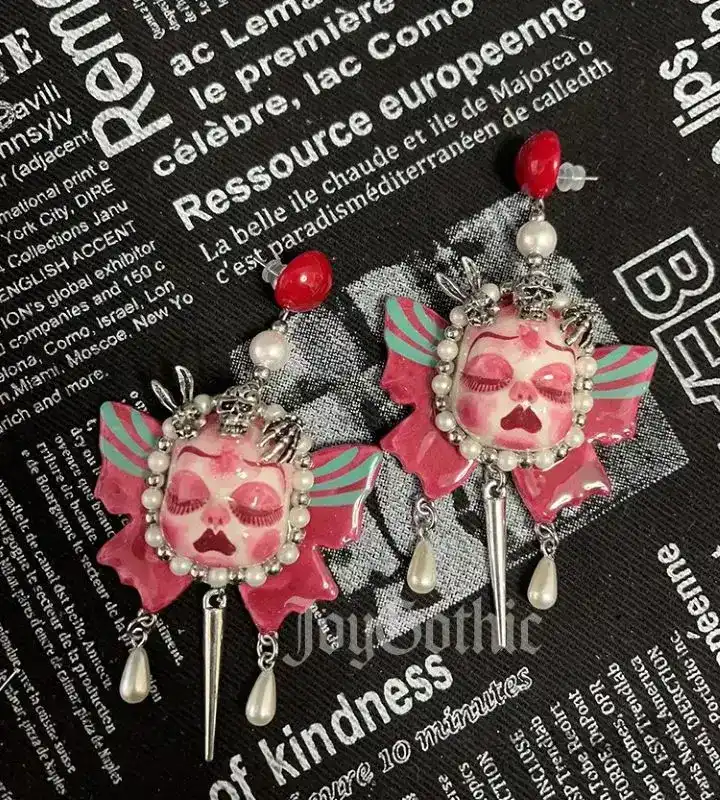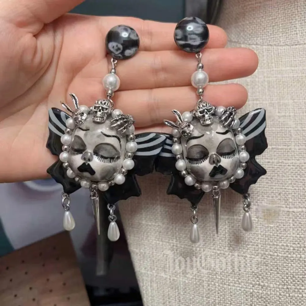 Inspired by the chaotic beauty of Y2K rebellion and gothic femininity, these handmade goth earrings transform fragility into power. The butterfly, a symbol of rebirth, fuses with a gothic doll’s haunting charm, crowned by metal skulls and framed in pearls. Each detail tells a story of defiance and allure, handcrafted for those who turn darkness into style. Perfect for goth girls, e-girls, and alt-fashion lovers who crave dramatic elegance for club nights, festivals, or moody photo shoots.